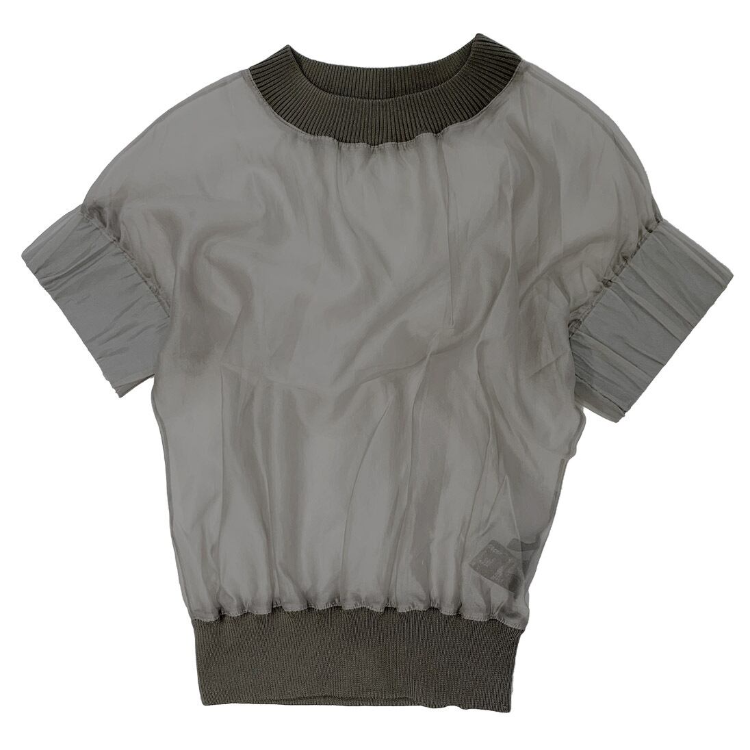 袖口切り替えにはゴム、衿ぐりと裾にリブを使用したトップスです。